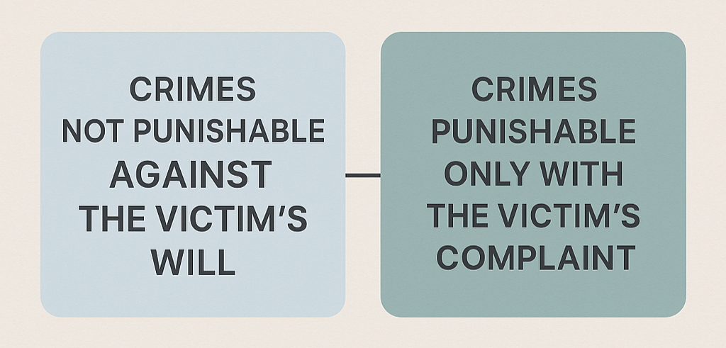 These are crimes where prosecutors can begin a case without the victim’s initial complaint, but if the victim later states that they do not want the offender punished, the prosecution must close the case.